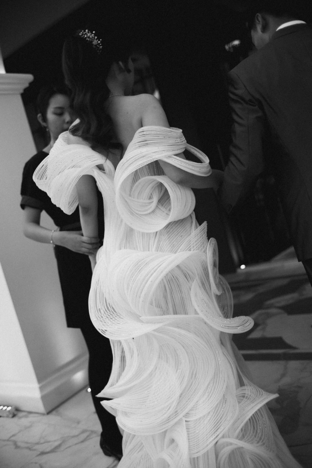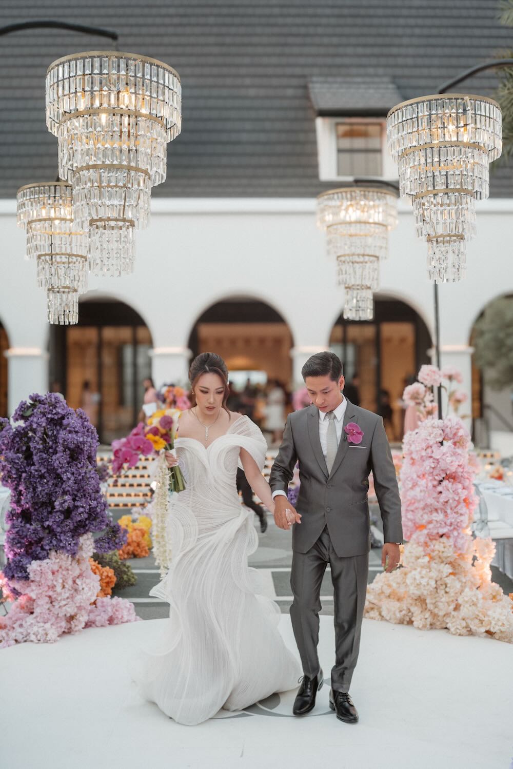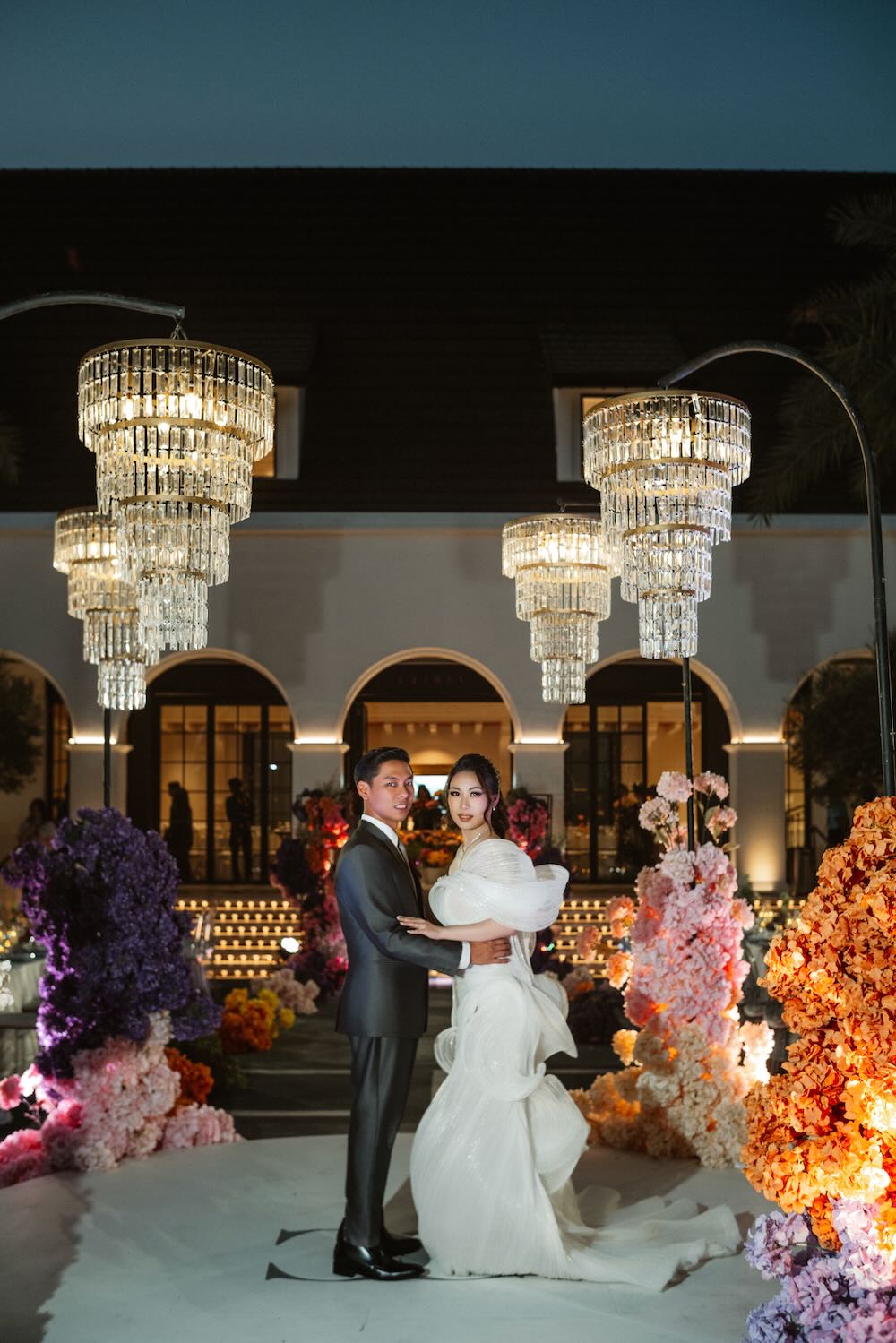 For Chris and Cindy, the concept revolved around flow—organic lines echoing one another from the florals to the gown’s sculptural curves. Summer tones, soft arcs, and natural textures merged into one continuous gesture, turning the venue into a living artwork. Not merely a celebration, but a moment performed through color and form: a gentle, confident bloom.