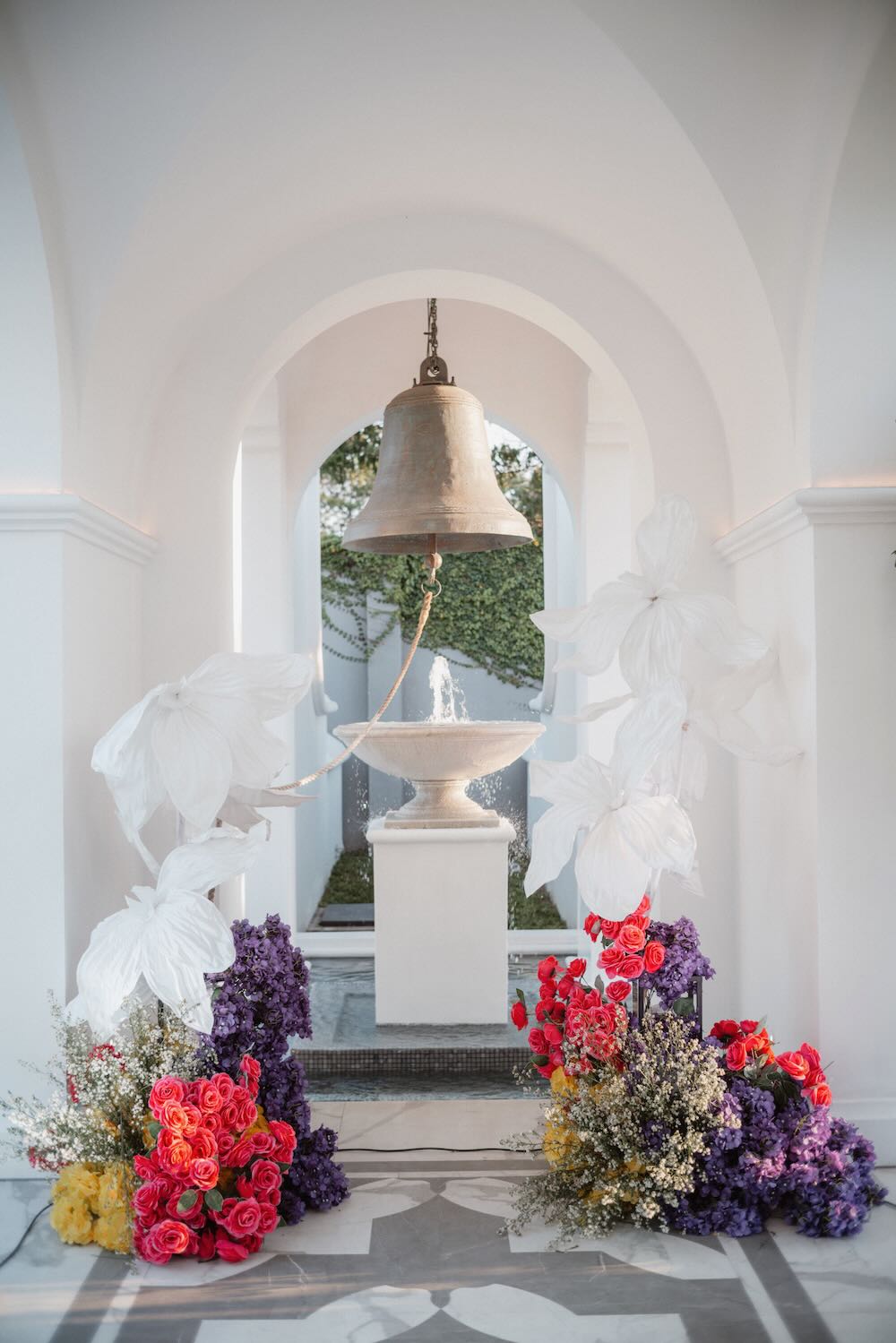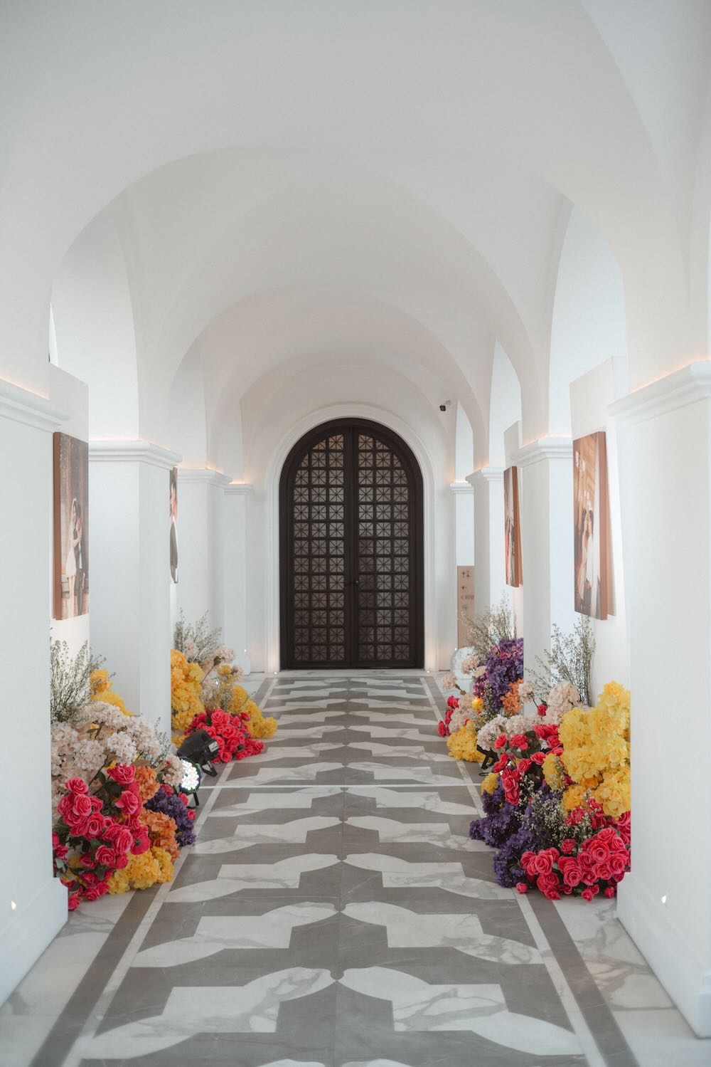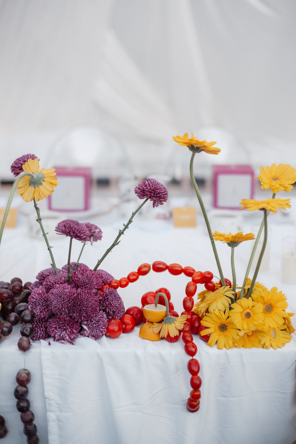 Estate set the stage as a clean, quiet canvas—an architectural field where fruit and flowers were treated like sculptural elements rather than décor. Chains of lemons, marigolds, and cherries stretched across the space in warm, sun-heavy gradients, forming a still-life that refused to sit still. Nature was arranged with intention: bright, raw, and slightly surreal, giving the wedding a sense of movement even in its silence.