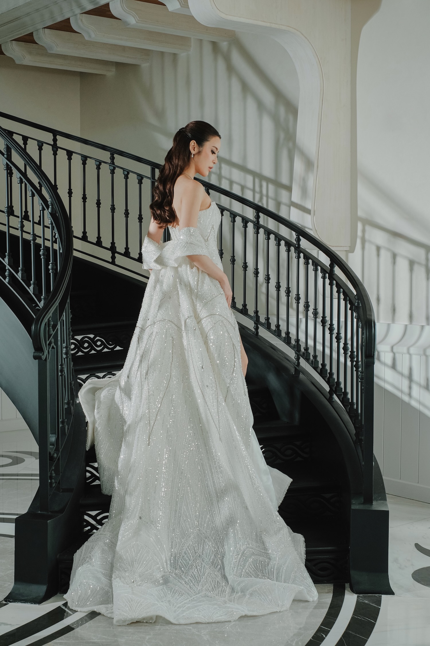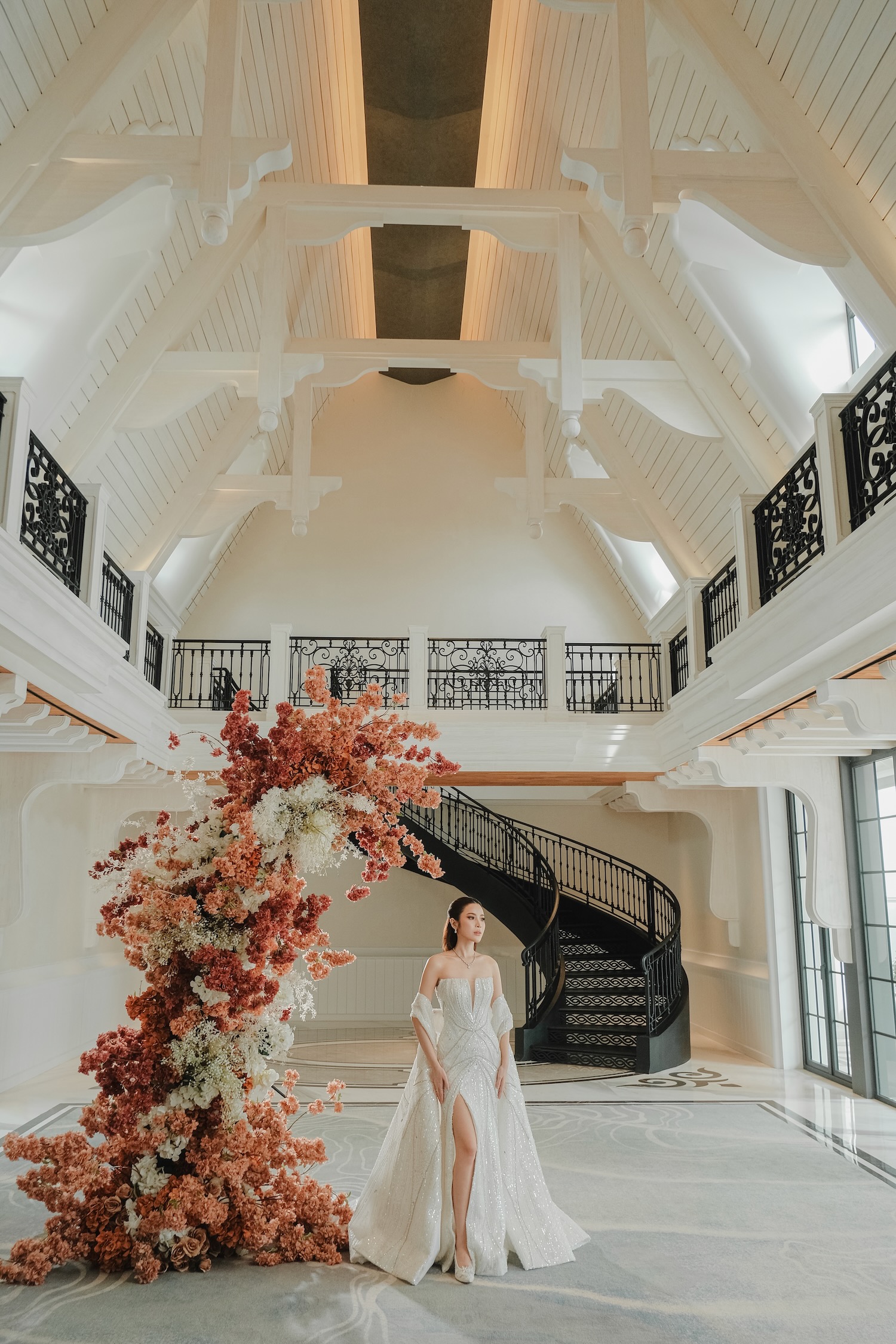 Styled for a wedding fair inside the Chimes Room at Estate89, this shoot embraced what was already there: space, light, and quiet architecture. The room itself did most of the talking — a soft curve of staircase, pale tones, and stillness that didn’t ask to be filled. So the floral design followed that cue. It wasn’t about scale, but about form and placement. Each stem was positioned with care, responding to the structure rather than competing with it. Even the smallest arrangements felt considered. Set against Estate89’s sculptural backdrop, the simplicity became the statement — proof that when styling is intentional, less really does become more.